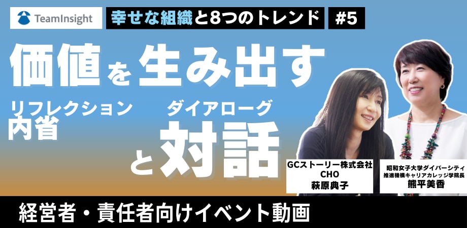 『 “幸せ”と“成果”を両立する組織づくり』をテーマに、重要なノウハウをお持ちのゲストお招きし、未来を切り開くための7つの羅針盤を探求します。第5回目は、『リフレクション(REFLECTION) 自分とチームの成長を加速させる内省の技術』、『ダイアローグ 価値を生み出す組織に変わる対話の技術』の著者、 昭和女子大学ダイバーシティ推進機構キャリアカレッジの熊平美香氏をお招きし、世界中から注目の集まる内省(Reflection)と対話(Dialogue)の技術で、いかに個人と組織(チーム)の成長を加速させるかについてトークセッションを行います。