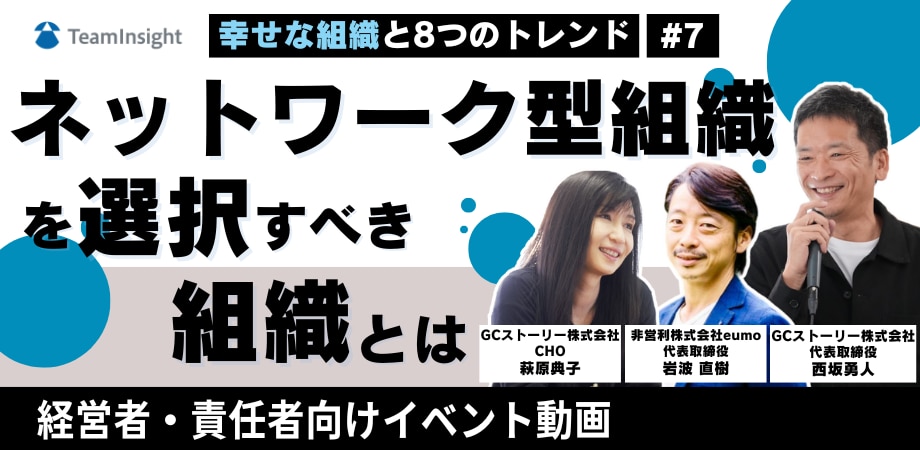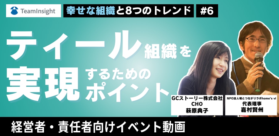 『 “幸せ”と“成果”を両立する組織づくり』をテーマに、重要なノウハウをお持ちのゲストお招きし、未来を切り開くための7つの羅針盤を探求します。第6回目は、NPO法人場とつながりラボhome's vi 代表理事であり、『ティール組織――マネジメントの常識を覆す次世代型組織の出現』解説者の嘉村賢州氏をお招きし、次世代型組織の実現と、組織づくりの実践に役立つトークセッションを行います。